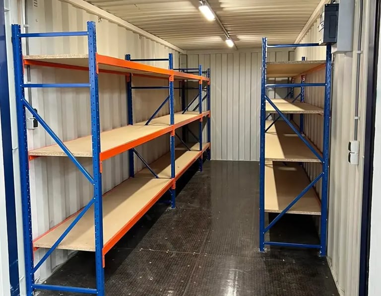 Estanterías metálicas, bancos de trabajo y portones de acceso.