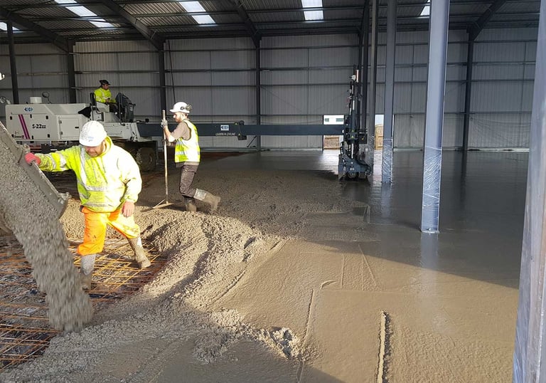 Reglas vibradoras, nivelación láser y curado químico asistido.