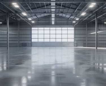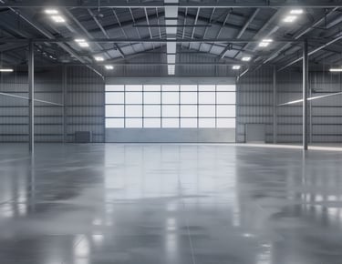 Portones de gran escala, iluminación técnica y pisos pulidos con acabado mecánico